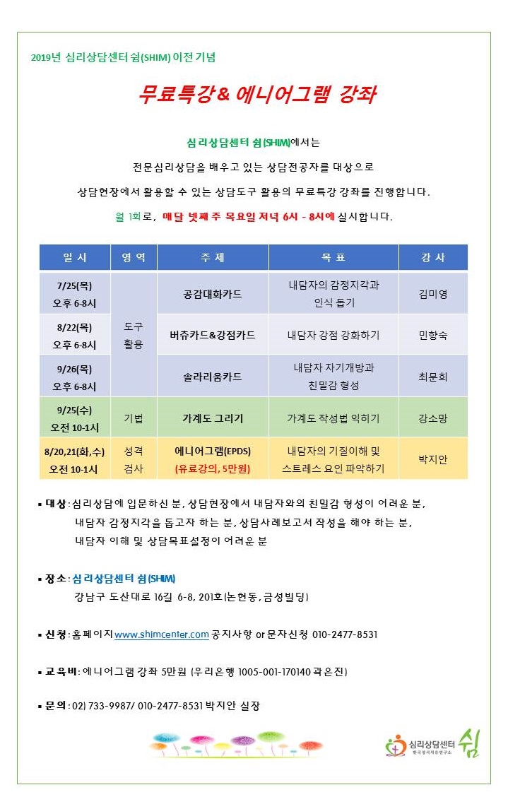 센터 이전기념으로 무료특강 및 에니어그램 강좌를 개설합니다.